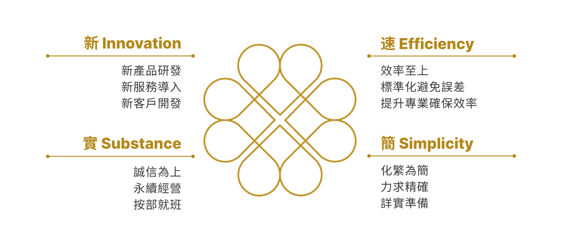 「新、速、實、 簡」是我們集團成立以來就設定的經營理念及要建立的企業文化,也是所有成員行事態度的準則。