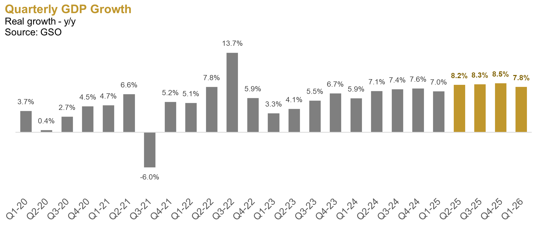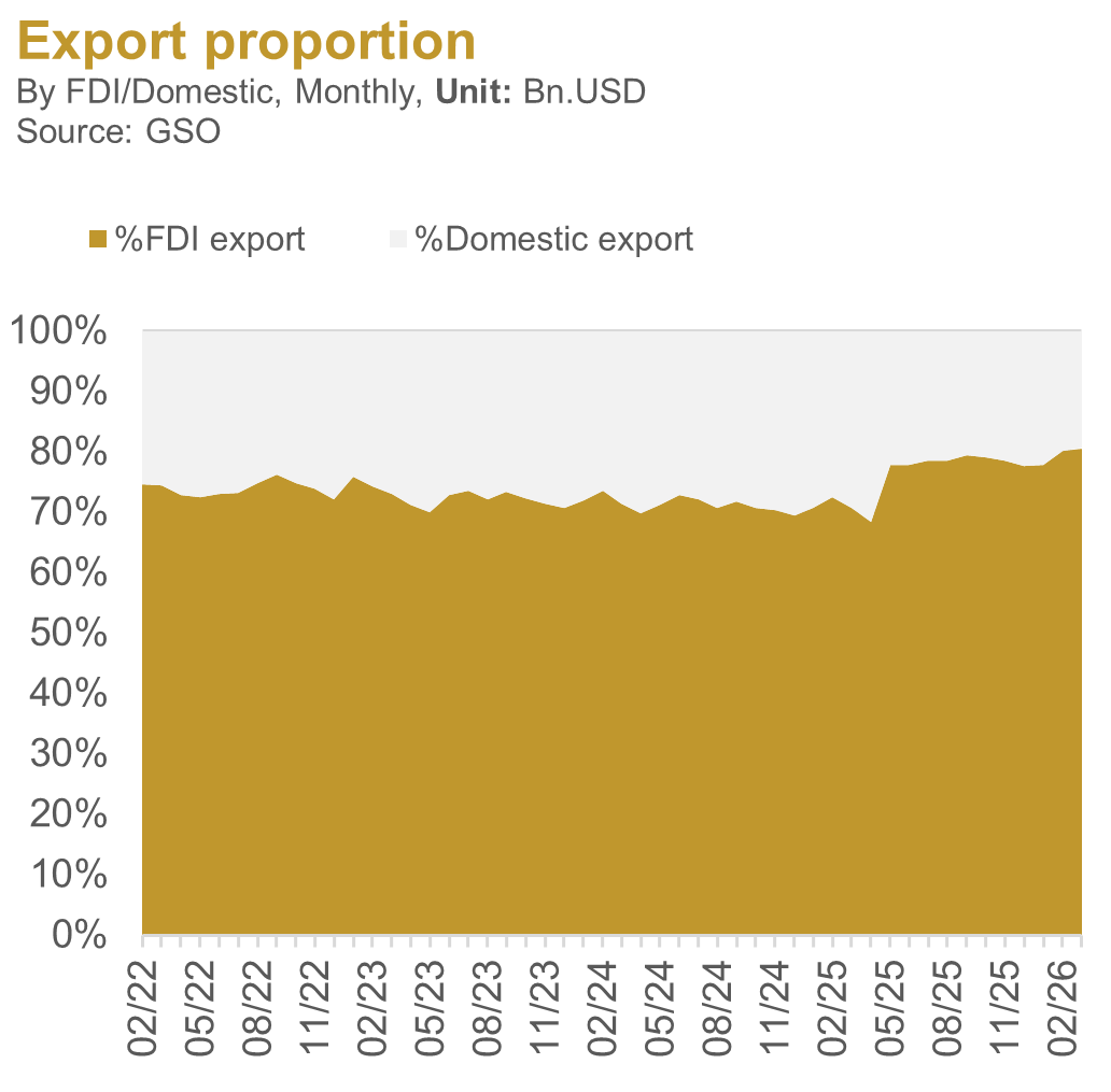 The kicker: export growth is almost exclusively FDI-driven. While foreign players dominate high-tech, domestic firms—anchored in agriculture, textiles, and timber—are reeling from tariff shocks and a global slowdown. Q1 2026 data confirms this stark rift: overall exports surged 19.1% YoY, but domestic players saw a 16.6% contraction (capturing just 19.9% of the pie), while the FDI sector skyrocketed 33.3% to command a staggering 80.1% market share.