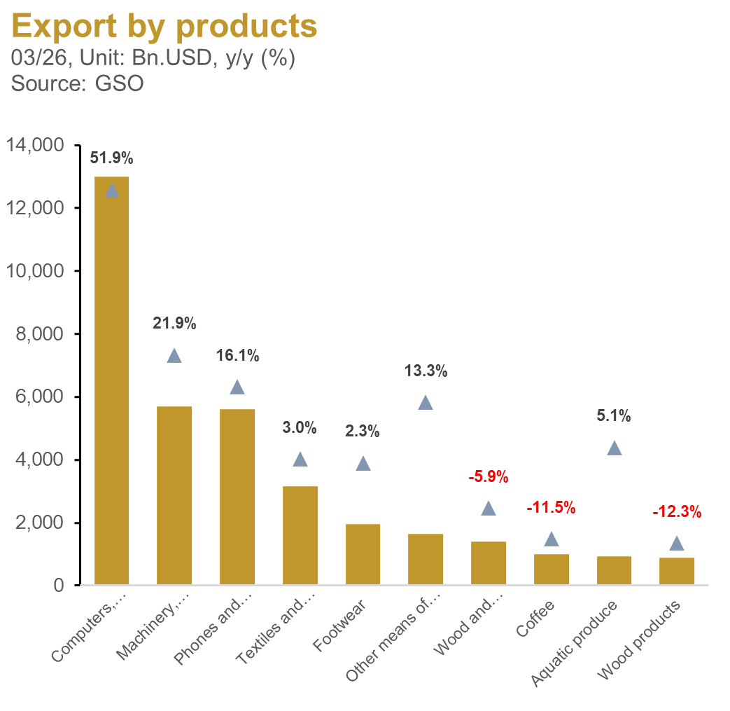 March 2026 export data highlights the dominance of electronics and handsets. These sectors have spearheaded growth since ‘Liberation Day,’ underscoring a deepening ‘China +1’ shift. This diversification trend remains the primary engine behind Vietnam’s resilient export performance.