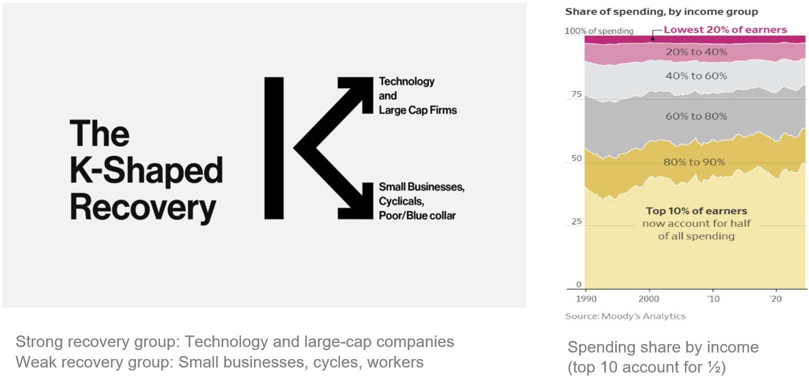 Today, the K-shaped model has evolved from a post-pandemic anomaly into a structural fixture of the global economy, defying early forecasts. In the U.S., ‘Big Tech’ and AI pioneers have emerged as the clear victors. We are witnessing a stark divergence: a segment of elite investors is ‘snowballing’ vast wealth through these high-growth engines, while the broader population remains sidelined, grappling with stagnant wages and volatile living costs.