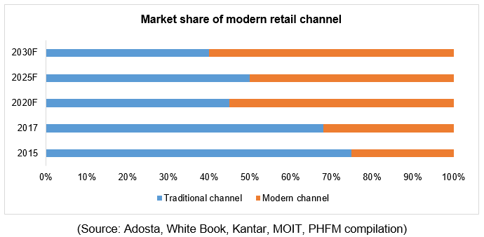 Kênh bán lẻ hiện đại được dự đoán sẽ “soán ngôi” kênh bán lẻ truyền thống trong tương lai. Cụ thể, tỷ trọng của kênh bán lẻ hiện đại có thể chiếm 50% vào năm 2025 và 60% vào năm 2030.