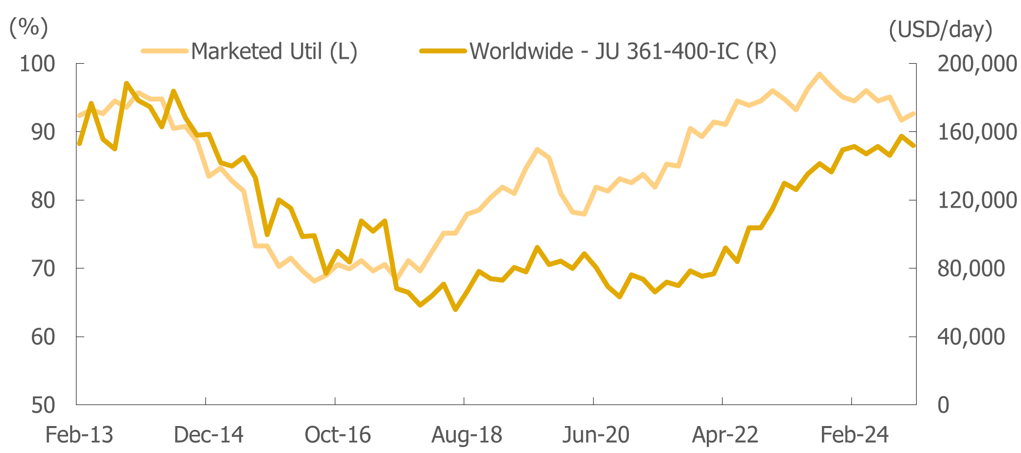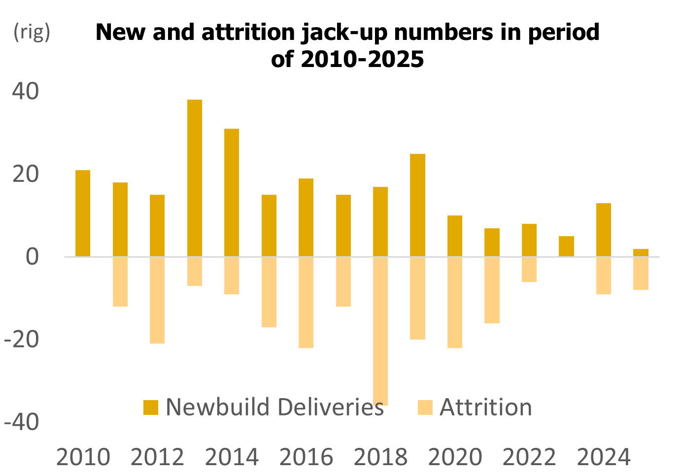 As oil prices have remained stable around USD 70/barrel for the past three years, global drilling activities have improved significantly compared to the COVID pandemic period. And the focus shifted toward shallow-water projects, among the largest resources with low break-even costs. As a result, demand for jack-up rigs, particularly from Middle Eastern operators, has risen notably. For nearly a decade, the jack-up market had been distressed and oversupplied, with little expectation that marketed utilization would exceed 90%. However, this began to change in 2022-23, marking the start of a new cycle as a significant wave of exploration and production (E&P) projects commenced globally.