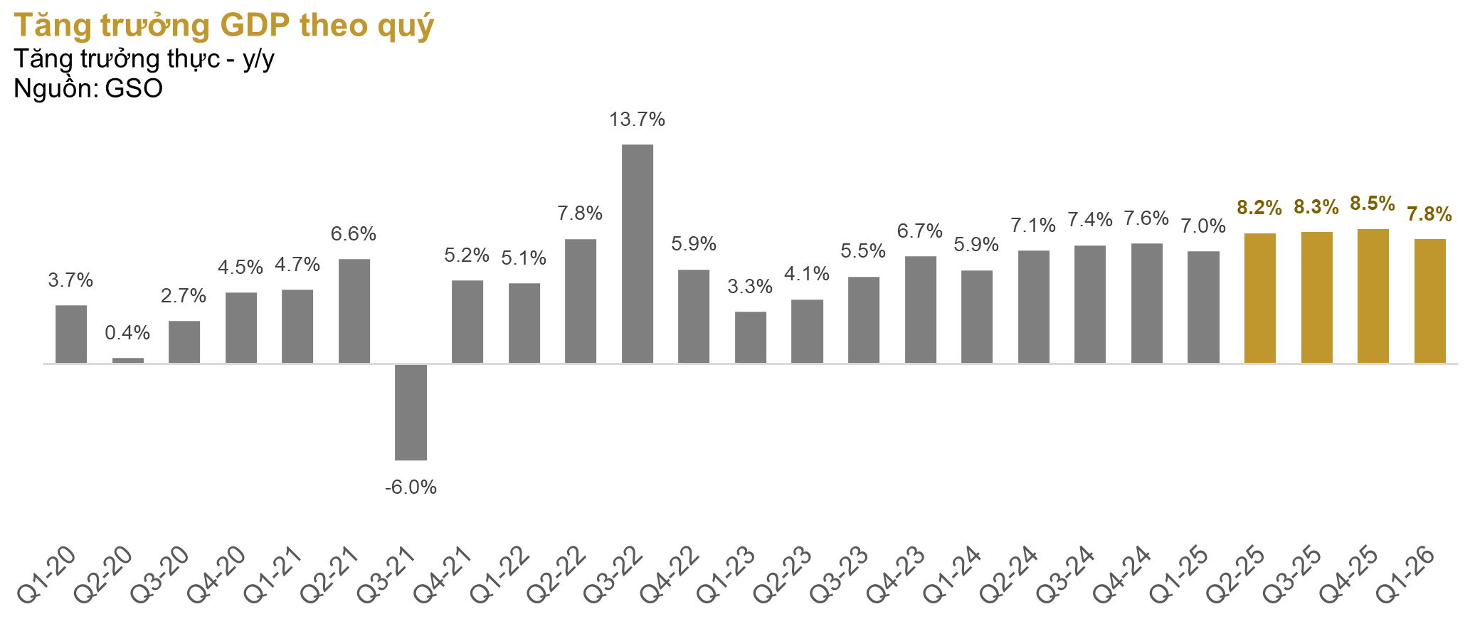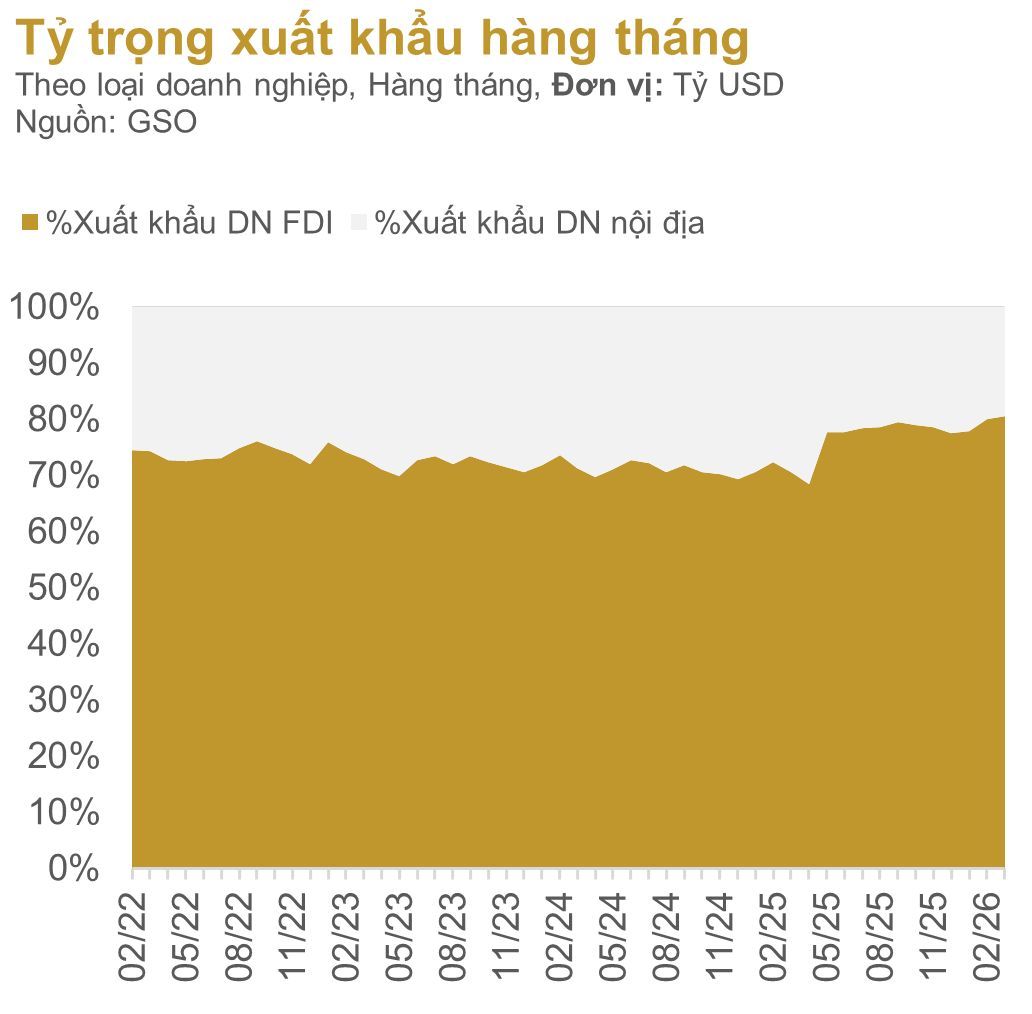 Điểm đáng chú ý ở đây là tăng trưởng xuất khẩu lại chủ yếu nằm trong tay các doanh nghiệp FDI, trong khi ở phần ngược lại các doanh nghiệp nội địa chủ yếu hoạt động trong các ngành nông nghiệp, lương thực, thực phẩm, dệt may, gỗ,… Các ngành nghề này đã chịu sự tác động tiêu cực sau cú sốc thuế quan, sự chậm lại của kinh tế thế giới. Theo Cơ quan thống kê quốc gia, tính chung quý 1/2026, kim ngạch xuất khẩu tăng 19.1% y/y. Trong đó, Khu vực kinh tế trong nước đạt 24,47 tỷ USD, giảm 16,6%, chiếm 19,9% tổng kim ngạch xuất khẩu; khu vực có vốn đầu tư nước ngoài (kể cả dầu thô) đạt 98,46 tỷ USD, tăng 33,3%, chiếm 80,1%.