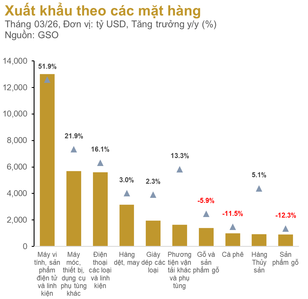 Có thể nhìn qua biểu đồ xuất khẩu mới nhất vào tháng 3 năm 2026, không khó để nhận thấy các mặt hàng chiếm tỷ trọng lớn nhất là các thiết bị điện tử, điện thoại. Đây cũng là các mặt hàng có mức tăng trưởng mạnh nhất sau “ngày giải phóng” cho đến nay, thể hiện xu hướng chuyển dịch chuỗi cung ứng ra khỏi Trung Quốc (China +1). Điều này giải thích phần lớn cho sự mạnh mẽ trong xuất khẩu của Việt Nam.