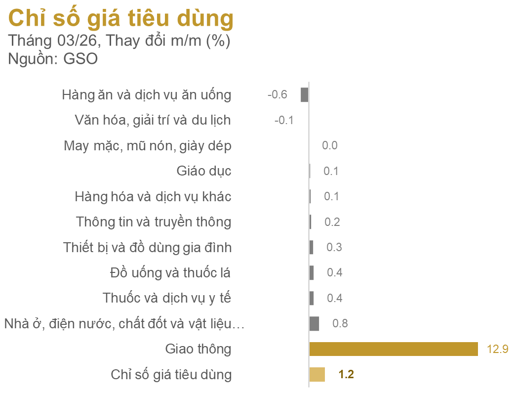 Quay trở lại với hiện tại. Tình hình chiến sự tại Iran đã khiến giá dầu tương lai Brent có thời điểm đạt 118 USD/thùng (so với 61 USD/thùng vào cuối năm 2025), gây áp lực lạm phát ngay lập tức lên trong tháng 3, chỉ số Giao thông đã tăng 12.85%, tác động làm CPI chung tăng 1.28 điểm %. Chúng tôi cho rằng đây mới chỉ là bắt đầu cho áp lực lạm phát về sau.