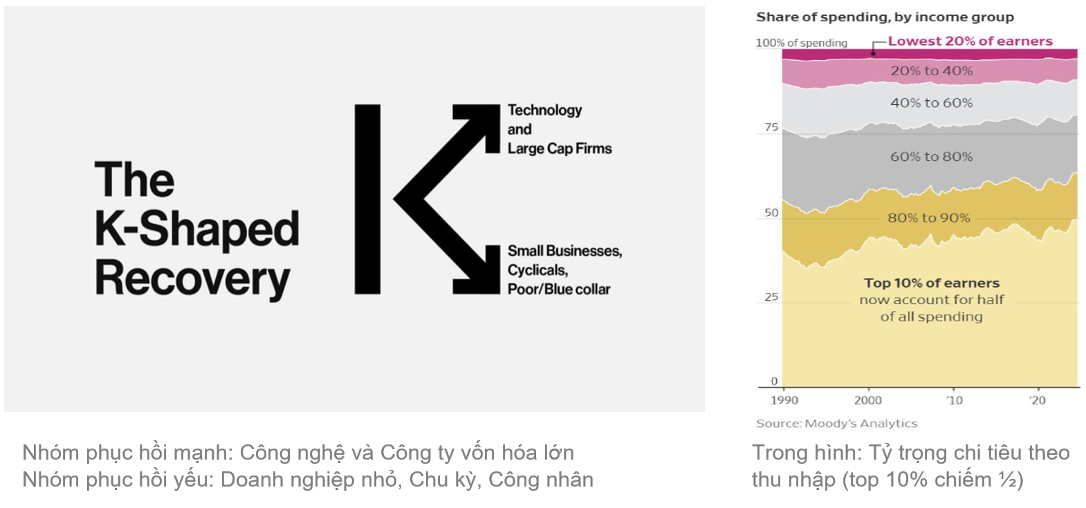 Tuy nhiên hiện tại, mô hình chữ K đã không chỉ gói gọn trong bối cảnh sau dịch mà dường như đang trở thành một biểu hiện mang tính cấu trúc đối với nền kinh tế, bức tranh sáng tối đã rất khác so với các dự báo ban đầu. Ví dụ như tại Mỹ, người chiến thắng lại là các ông lớn về công nghệ, đặc biệt là công nghệ AI. Điểm chung hiện tại là bộ phận dân số, nhà đầu tư hưởng lợi từ các ngành này đang ngày càng giàu lên và “lăn cầu tuyết” mỗi ngày trong khi số còn lại kém may mắn hơn phải chịu sự bất định trong chi phí sinh hoạt, tăng trưởng thấp.