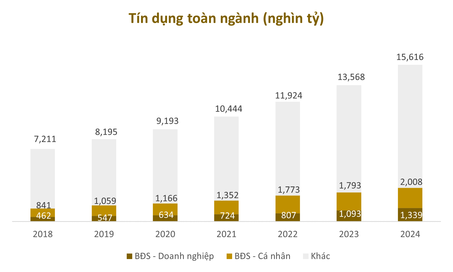 Bất động sản chiếm tỷ trọng đáng kể trong hệ thống tín dụng của Việt Nam, dư nợ cho vay kinh doanh và cá nhân đạt 4,3 triệu tỷ đồng vào năm 2024 — tăng 16% so với cùng kỳ năm trước và chiếm 21,4% tổng dư nợ tín dụng.