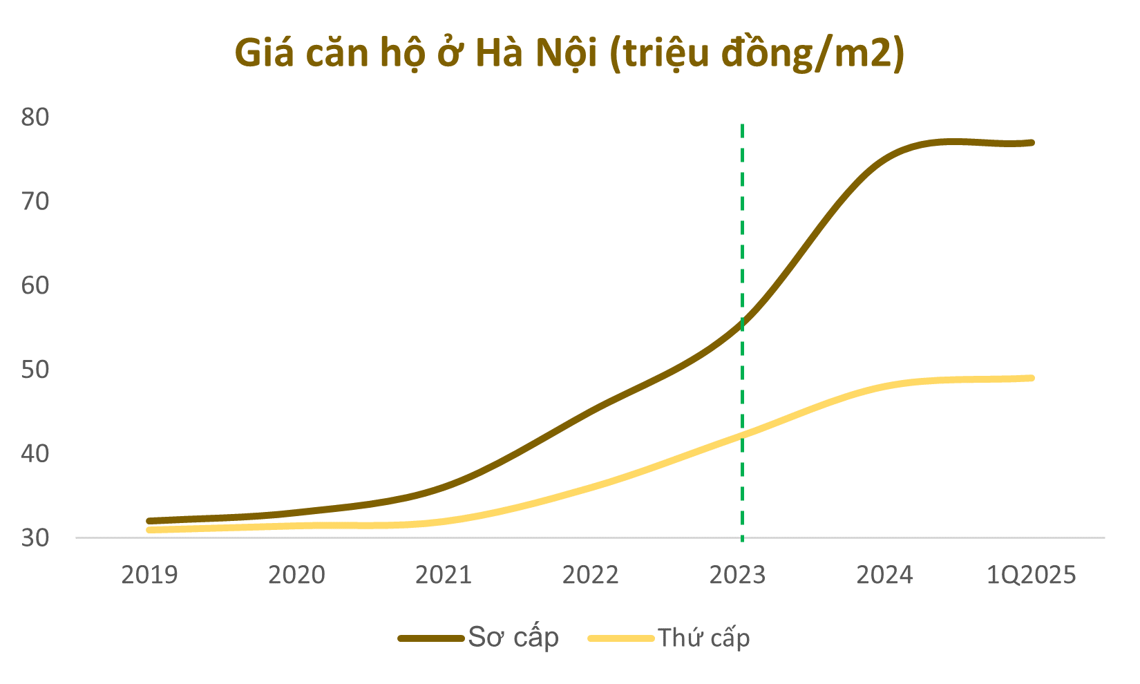 Tại Hà Nội, giá bán sơ cấp tăng mạnh 36%, từ 55 lên 75 triệu đồng/m² trong năm 2024 và tiếp tục nhích lên 77 triệu đồng/m² trong quý I/2025, với giá thứ cấp cũng duy trì xu hướng tăng nhẹ.