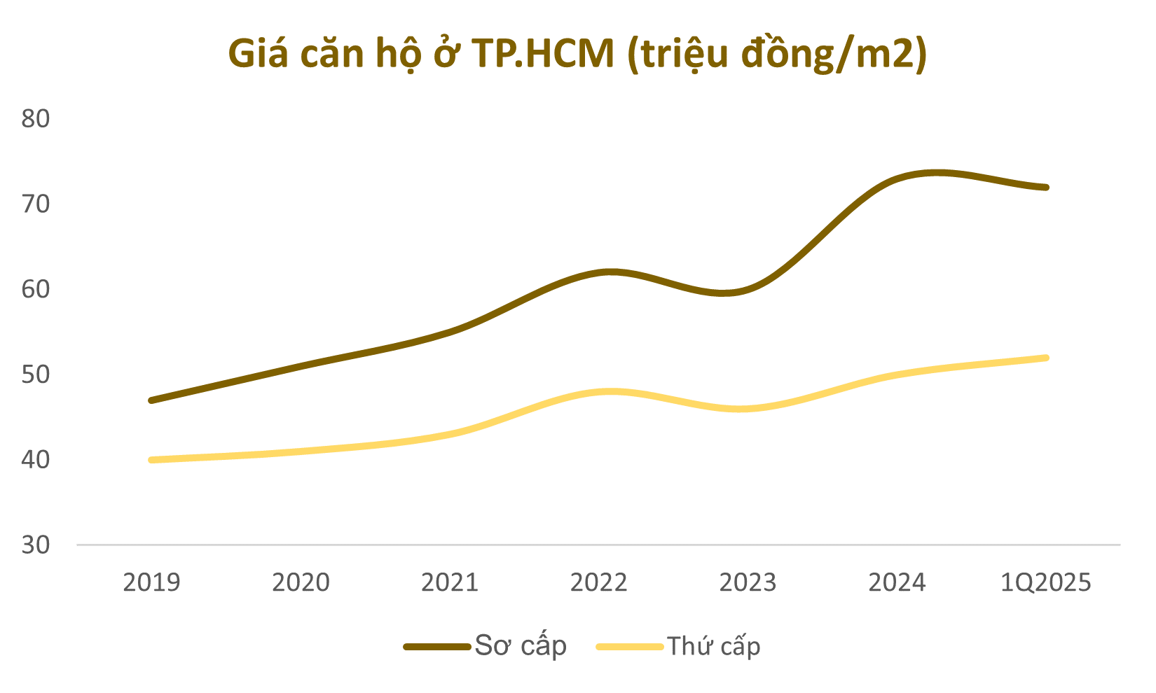 Giá căn hộ đã phục hồi sau giai đoạn giảm trong năm 2023, đánh dấu sự khởi đầu của một chu kỳ mới. Tại TP. HCM, giá bán sơ cấp tăng 22%, từ 60 lên 73 triệu đồng/m² trong năm 2024 trước khi giảm nhẹ trong quý I/2025, trong khi giá thứ cấp cũng ghi nhận xu hướng phục hồi.