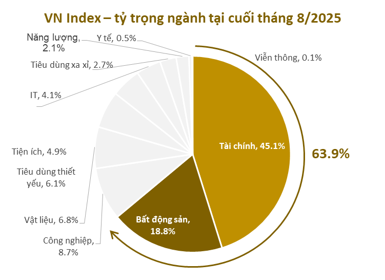 Chỉ số VN Index tập trung chủ yếu vào hai nhóm ngành — Tài chính (45,1%) và Bất động sản (18,8%) — chiếm gần hai phần ba tổng vốn hóa thị trường (63,9%). Dù Bất động sản là nhóm ngành lớn thứ hai xét riêng lẻ, nhưng tầm ảnh hưởng thực tế của nó còn vượt xa hơn thế.