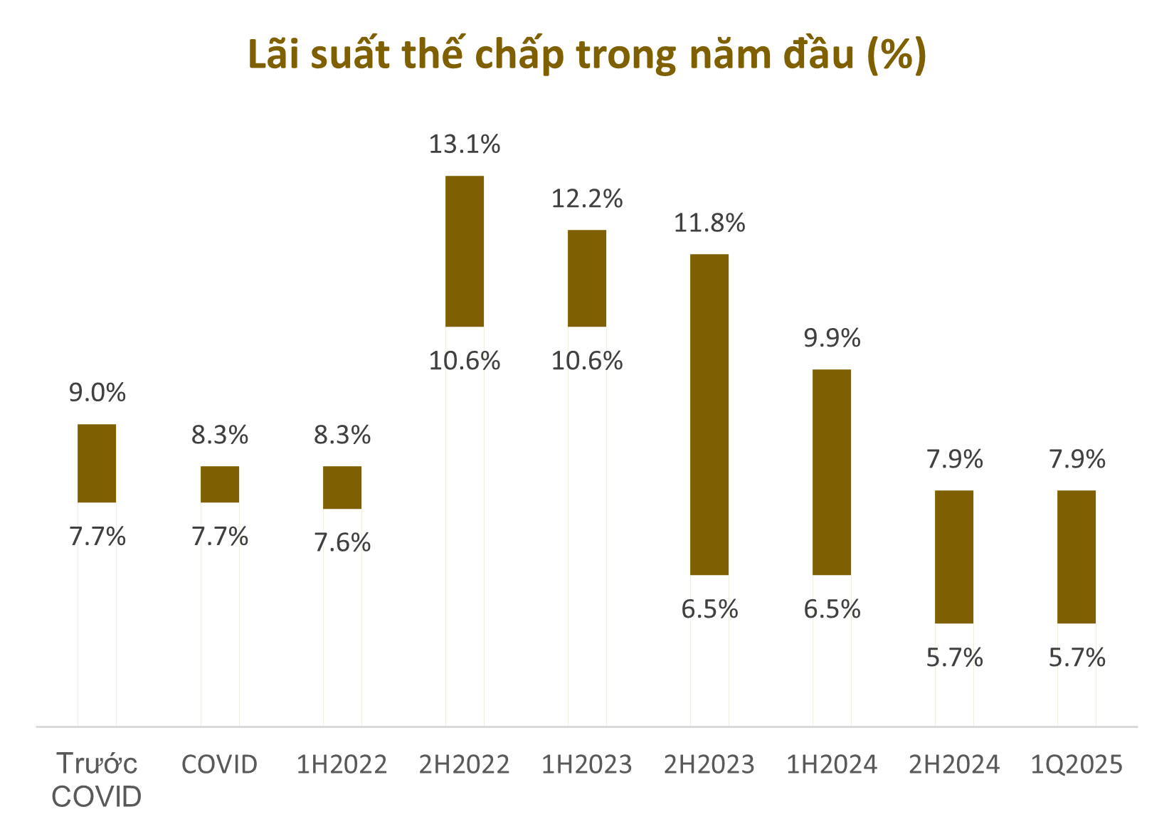 Về chính sách, các chương trình cho vay thế chấp tại Việt Nam đã dần được nới lỏng sau giai đoạn COVID. Lãi suất vay mua nhà tại các ngân hàng lớn đã giảm từ mức 7,7–9,0% trước COVID xuống còn 5,7–7,9% vào quý I/2025, phản ánh chính sách tiền tệ nới lỏng của Ngân hàng Nhà nước Việt Nam.