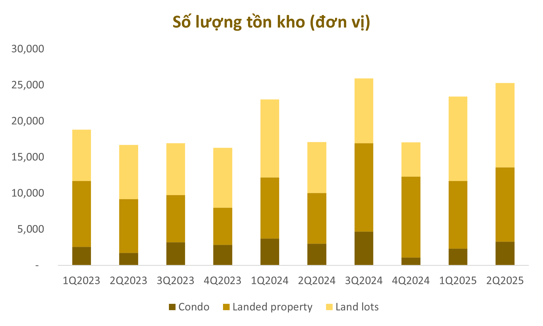 Tồn kho đã tăng mạnh kể từ quý III/2024 sau khi luật mới có hiệu lực. Tính đến quý II/2025, tổng lượng tồn kho đạt hơn 25.294 sản phẩm, bao gồm 3.287 căn hộ chung cư, 10.290 nhà ở thấp tầng và 11.717 lô đất. So với quý I/2025, tồn kho tăng nhẹ, trong đó nhà ở riêng lẻ tăng 9%, đất nền tăng 0,3% và căn hộ chung cư tăng tới 40,5%.
